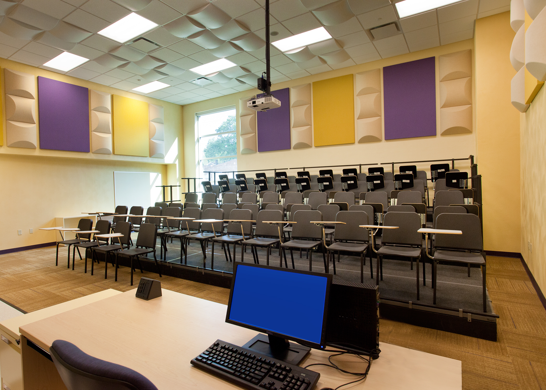 The state-of-the-art school features a two-story classroom wing with 26 classrooms to accommodate up to 400 students. Kindergarten through second grades on the ground floor have direct access to an outdoor classroom and playground. Third through sixth grades, two science labs and an art studio are on the second floor. A vocal rehearsal room and band room with operable wall opens to the cafetorium, a combined cafeteria and auditorium, for performances.
