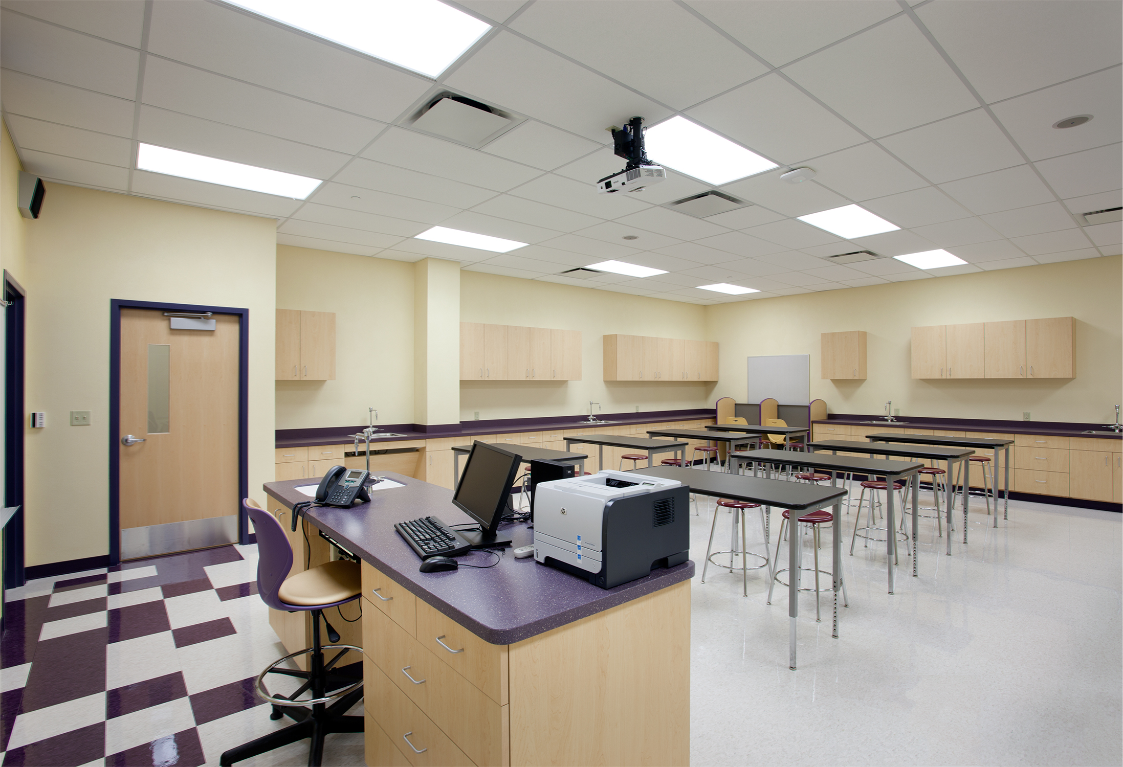 Architectural features include a two-story lobby and a main corridor with clerestory glass that floods the hallways and classrooms with natural light. The building also includes administrative and nursing offices, teacher preparation rooms, storage rooms, kitchen, utility and janitorial spaces.