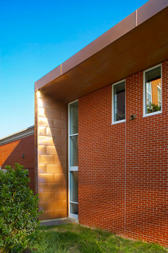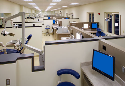 Among taller building on a tree shaded campus, a new copper canopy crowns the corner addition to an existing clinical facility. The 4,000 square foot lecture hall beside the entry completes the front lawn of the campus. Inside, an extension of the current 80 operatories offers and additional 24 dental stations, four of which are dedicated to pediatric care.